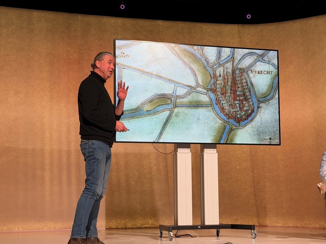 Rene de Kam bij een stadsplattegrond die de vroegere fascinatie met het verleden van Utrecht toont