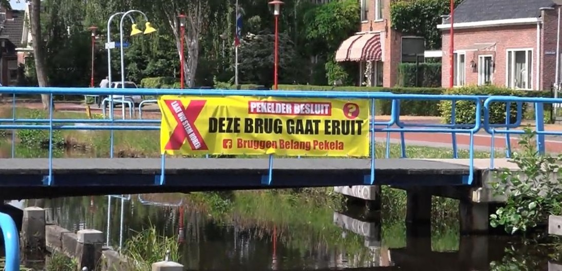 Decennialang hanteerde Pekela, dat lange tijd bekendstond als ‘het armste dorp van Nederland’, de kaasschaafmethode voor het bruggenonderhoud. Door achterstallig onderhoud dreigden de kosten de pan uit te rijzen. ‘In 2021 werd het vaarverkeer in het Pekelder Hoofddiep stilgelegd, omdat de bruggen niet meer veilig bediend konden worden’, vertelt Woltjer. In coronatijd besloot de gemeenteraad (tijdens een zitting achter gesloten deuren, vanwege de pandemie) dat er vanwege het budget slechts 13 van de 34 bruggen behouden konden worden. Pas na de gemeenteraadsverkiezingen drong de impact van dit raadsbesluit door. Onder leiding van Maurits Langeler kwam een groepje bewoners ertegen in verzet. Zij waarschuwden dat het dorp doormidden gedeeld dreigde te worden. Ook agrariërs sloten zich aan, omdat zij flink zouden moeten omrijden naar hun akkerland. De groep organiseerde vreedzame protestacties. ‘Maurits Langeler kwam met het idee om op alle bruggen banners te hangen met teksten als: “Deze brug gaat eruit”’, vertelt Woltjer. ‘Zelf ben ik tijdens een protestactie bij het gemeentehuis op een boerenkar met microfoon gaan staan om met honderden inwoners de raad toe te spreken. Maurits postte filmpjes op sociale media met achtergrondinformatie over onder andere de geschiedenis en de erfgoedwaarde van de bruggen.’