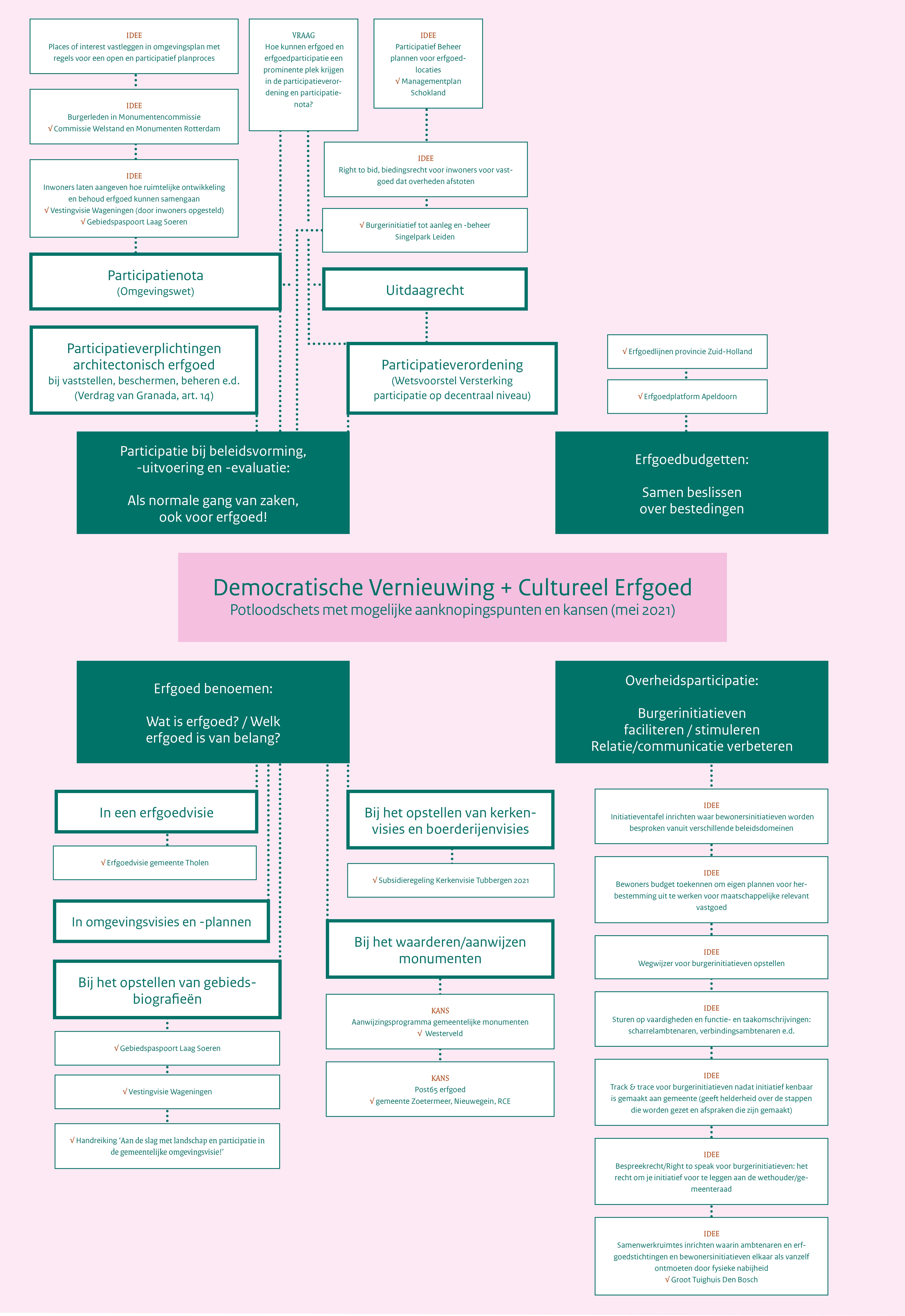 Als het over democratische vernieuwing en erfgoed gaat, wordt een rijke ader aan ideeën aangeboord. De mindmap is een eerste potloodschets van de mogelijkheden die voorbij zijn gekomen. Welke dingen pakken we de komende jaren samen op? Daarover praten we binnenkort door. Bekijk hier de oogst tot nu toe. Of lees verder in een van de essays of verslagen in het blokje documenten.